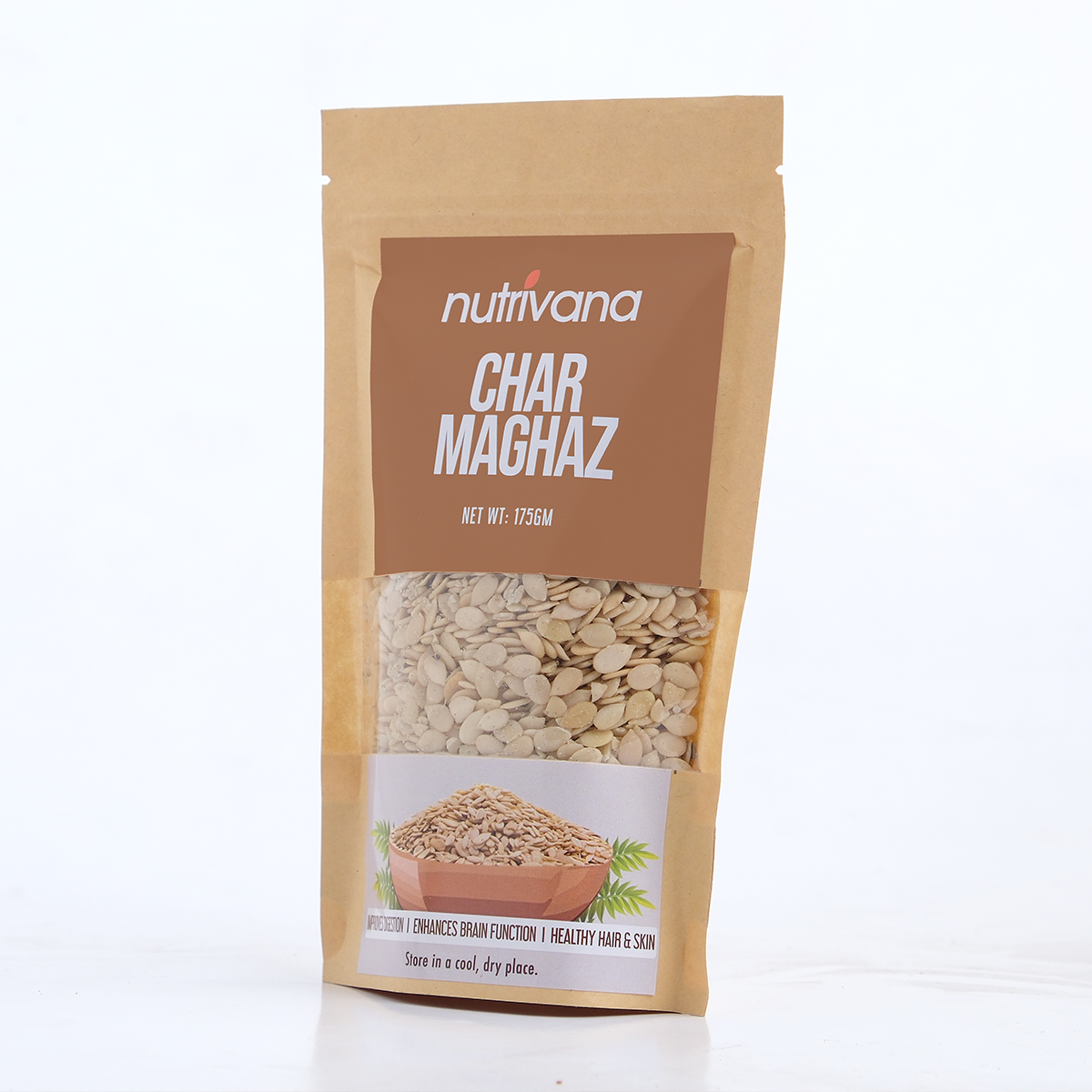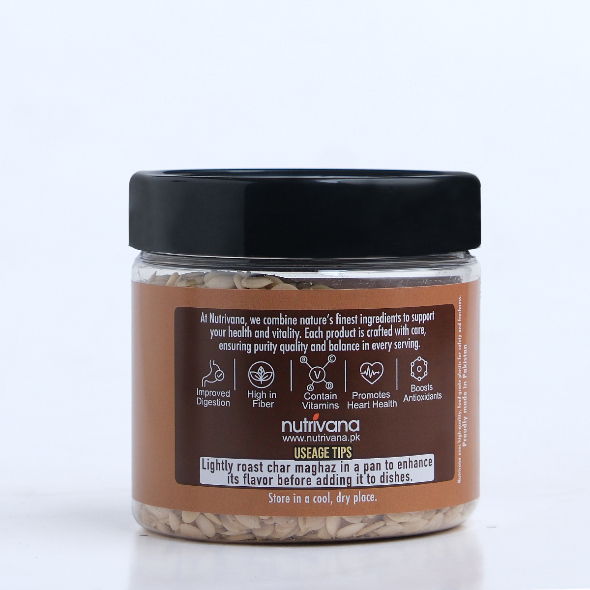 Nutrivana 100% Organic Char Maghaz is a traditional superfood blend of melon, watermelon, pumpkin, and cucumber seeds, celebrated for its rich nutrient profile. Packed with essential minerals, antioxidants, and healthy fats, this premium mix promotes vitality, boosts energy, and supports overall well-being.